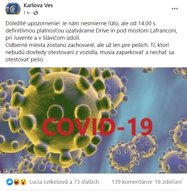 Bratislavská Karlova Ves od 14:00 uzatvára drive-thru testovacie miesta v Slávičom údolí, pri Iuvente a pod mostom Lafranconi. Dôvodom je zablokovanie komunikácií a zahltenie okolia autami, ktorými sa otestovať prišli obyvatelia nielen z mestskej časti, ale celého západoslovenského kraja, najmä zo Záhoria, objasnil hovorca Karlovej Vsi Branislav Heldes s tým, že uvedené miesta budú slúžiť na odbery pre peších.