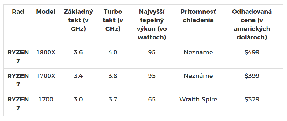 AMD vyzdvihuje najmä 52 % nárast inštrukcií za cyklus (IPC), vďaka ktorému by Ryzen mal konkurovať tomu najlepšiemu od Intelu. Nové procesory prídu v niekoľkých variantoch, pričom prvým a zároveň najvýkonnejším bude model Ryzen 7. Ten v sebe ukrýva osem jadier, 16 vlákien a jeho cena začína na hranici 329 dolárov (311 €). Ryzen 7 1800X, ako najvýkonnejší z rady, prichádza s taktom 3.6 GHz (turbo 4.0 GHz) a cenovkou iba 472 €. Ešte raz musíme zdôrazniť slovo „iba“, pretože priama konkurencia pre tento procesor, Intel Core i7-6900K, sa predáva za viac ako 1000 €.