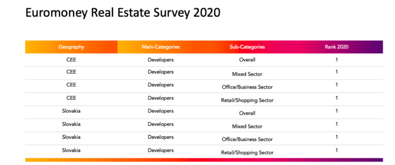 - Popredný európsky vydavateľ analýz a rešerší, portál Property EU, zverejnili aj tento rok svoj rebríček TOP developerov na európskom trhu. Je to už druhý rok po sebe, čo sme sa dostali na prvú priečku, čím sme si upevnili pozíciu lídra na trhu.