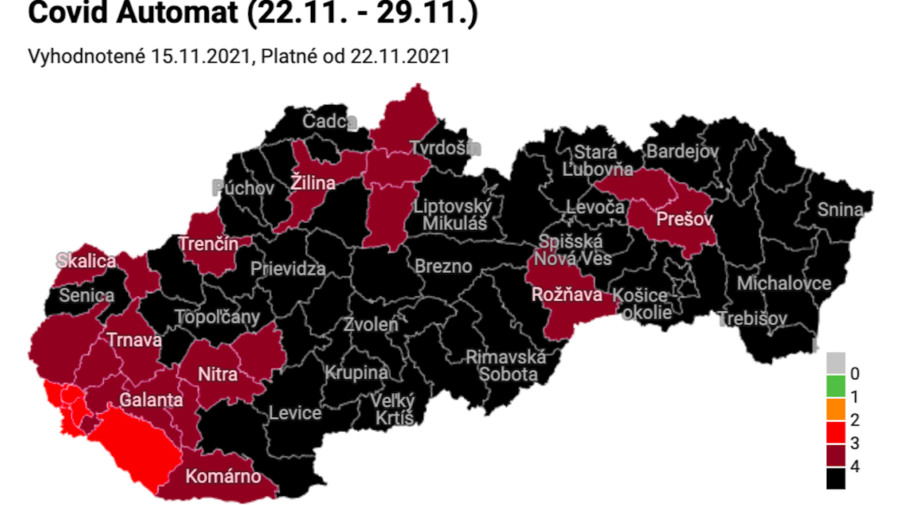 Od pondelka 22. novembra 2021 sa bude opäť meniť rozdelenie slovenských okresov. Nie je prekvapením, že zelené a oranžové okresy na mape budú chýbať aj počas ďalšie týždňa. Červených okresov bude 6, bordových 19 a ostatné okresy budú čierne.