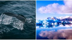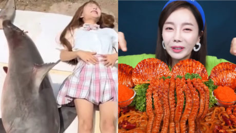 influencerka ležiaca pri bielom žralokovi a záber z mukbang videa