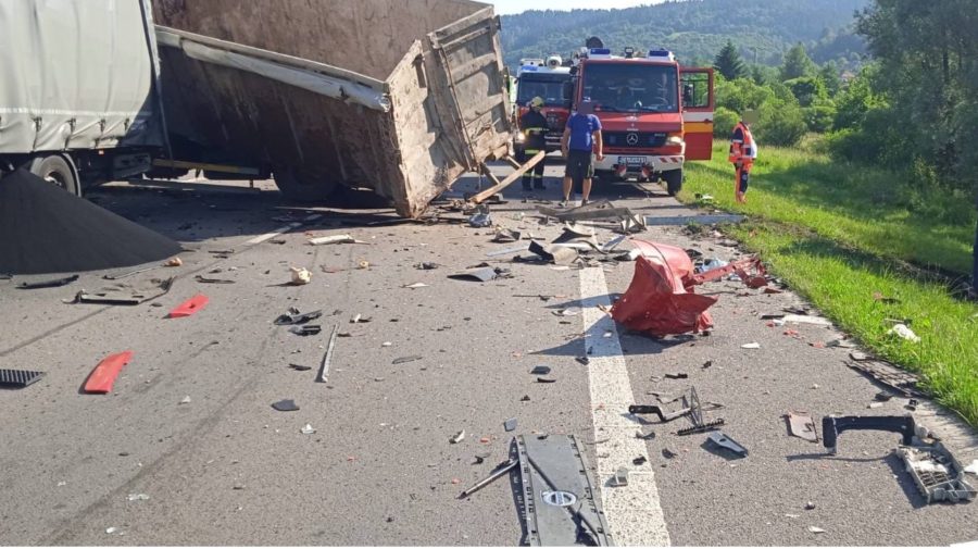 V úseku sa zrazili dve nákladné autá, tvoria sa kolóny. Policajti žiadajú všetkých účastníkov cestnej premávky, aby sa riadili ich pokynmi.