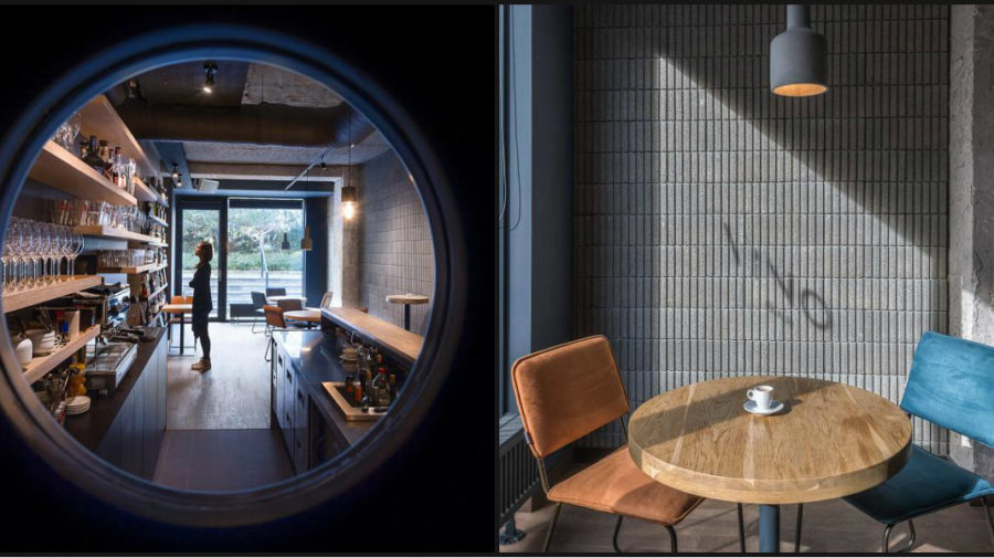 Farebná jednoduchosť. Našou snahou bolo, aby interiér pôsobil čisto a zároveň príjemne a útulne. Zvolili sme jednoduché farby – antracitovú na steny, interiérové dvere, podnož barového pultu, police, nábytok, ale aj radiátory a vzduchotechniku a decentnú bielu farbu na stenu v salóniku a na toaletách. O ostatné farby sa postarali samotné materiály – drevo a betón.