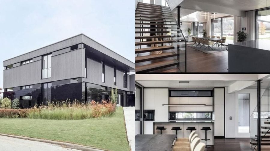 Domom sa hovorí „plávajúce“, a nie je to náhoda. Prízemie je obložené lesklými čiernymi dlaždicami, vďaka čomu prvé poschodie vyzerá, akoby sa vznášalo vo vzduchu. Tento efekt ešte umocňujú veľkorysé francúzske okná, ktoré svojimi rozmermi konkurujú masívnym vstupným dverám s impozantnými rozmermi 2,64 x 1,7 metra.