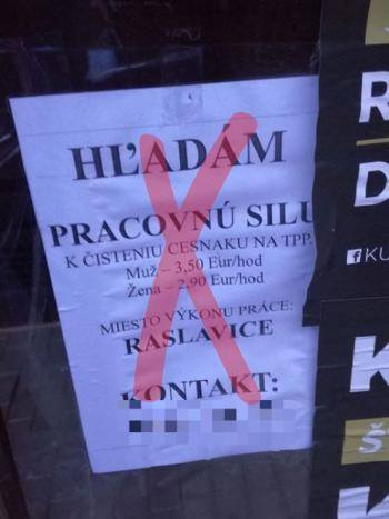 Slovenský národ taktiež „pobúrila“ reklama na ponuku práce, ktorá ukazuje, že čističky cesnaku to v Raslaviciach majú o niečo tažšie ako muži. Za čistenie cesnaku si totižto podľa tejto neznámej firmy, zaslúžia hodinovú mzdu nižšiu o 0,60 eur..