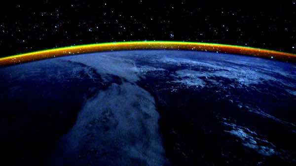 207. deň vo vesmíre- nad Indický oceánom. Žltý pruh je slnečná žiara, ktorá sa odráža nad atmosférou.