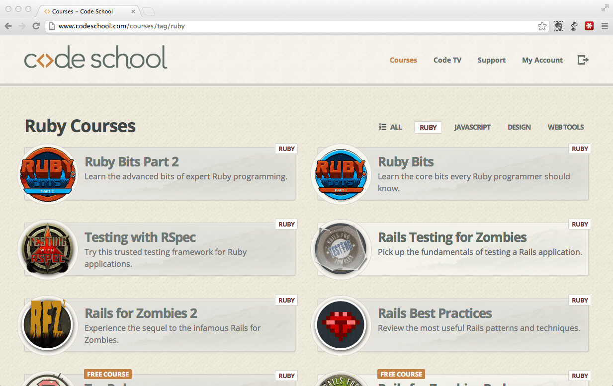 Po skončení kurzov v Codecademy či Code Avengers si pripravený rozšíriť svoje schopnosti s Code School. Na rozdiel od väčšiny interaktívnych vyučujúcich stránok, táto ponúka viac kurzov na prehĺbenie vedomostí , aby si sa mohol zmeniť na odborníka s osvedčenými postupmi v odvetví. Kurzy sú rozdelené do 4 hlavných tém: Ruby, JavaScript, HTML/CSS, iOS. Takmer všetky kurzy zapôsobia dizajnom a informatívnymi videami. Väčšina kurzov je zadarmo, ale ak zaplatíš25$ mesačne, získaš prístup ku všetkým kurzom, videám a výzvam.