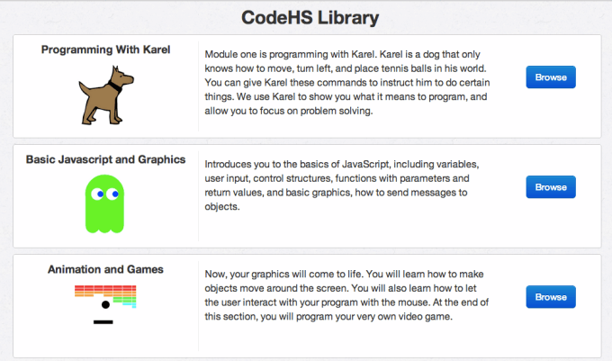 Doteraz sme písali o stránkach, ktoré sa venujú prevažne programovaniu webov a aplikácií, ale CodeHS je jednoduchý a zábavný návod na programovanie hier. Lekcie zahŕňajú riešenie problémov, JavaScript, animácie, dátové štruktúry a herný dizajn. Výhodou CodeHS je, že ťa naučí myslieť a riešiť problém ako programátor už prvým kurzom – Programming with Karel. Lekcie sú zábavné, naučíš sa napríklad ako kódom posunúť psa, dostaneš úlohy na spôsob ako zdvihnúť loptu a poskladať uteráky. Na rozdiel od vyššie uvedených, je potrebné sa zaregistrovať a platiť 25$ mesačne, aby si sa mohol vzdelávať, avšak skvelo a efektívne ťa naučí základy programovania hier.