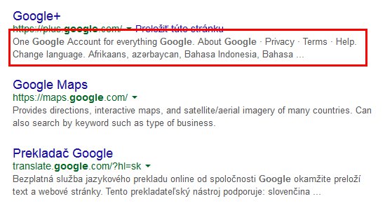 Meta popis (meta description) je krátky úryvok, ktorý môžete vidieť pod práve spomínaným titulkom. Platia pre neho veľmi podobné zásady.