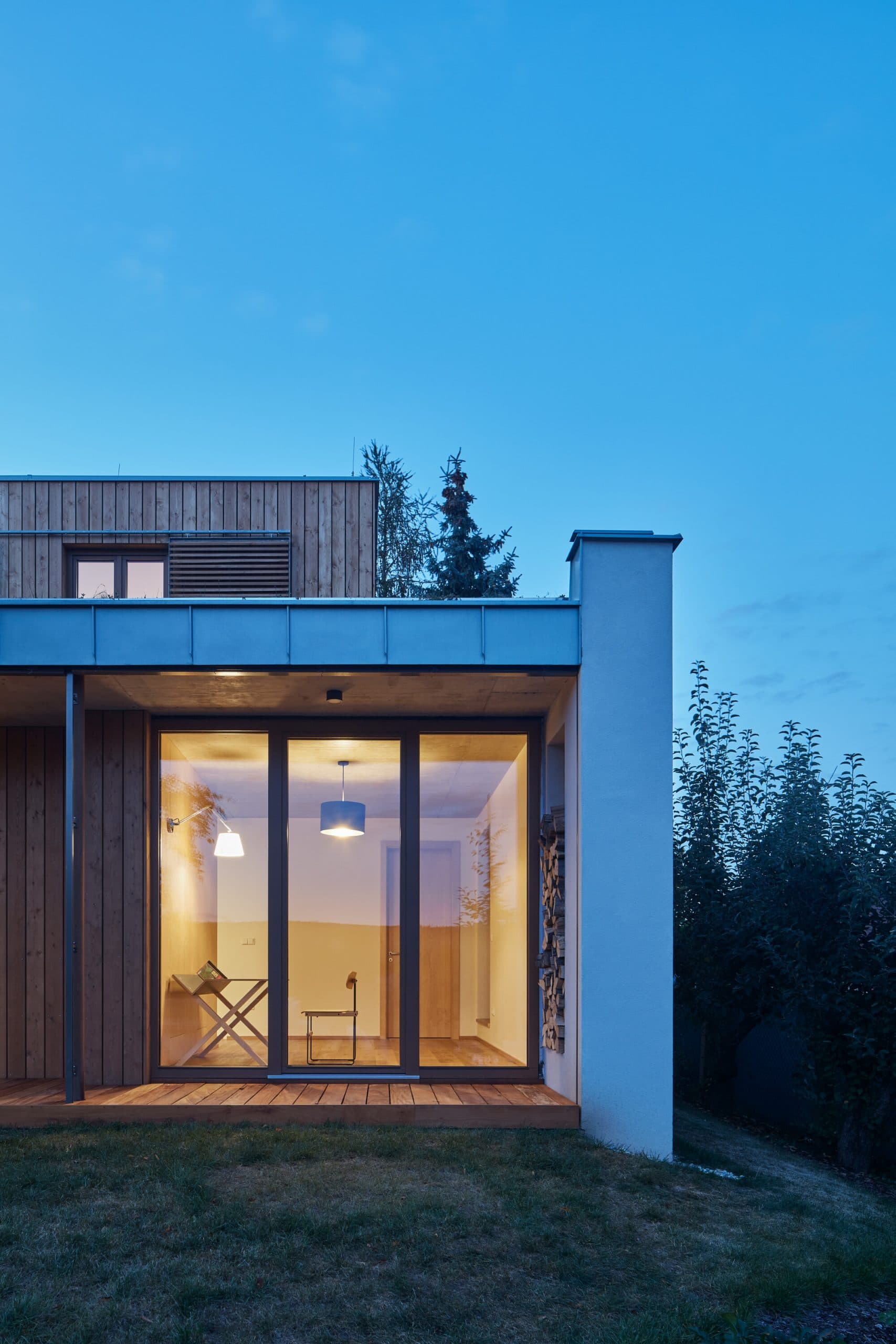 „Hlavnú hmotu domu sme maximálne natiahli medzi východnú a západnú hranicu, aby sme vytvorili čo najdlhšiu južnú fasádu – prehrievanie/vykurovanie domu slnkom vo vykurovacej sezóne. Letné slnko je naopak prirodzene tienené zapustením presklenej fasády (zápražím). Dom sme sa snažili na pozemku umiestniť čo najvyššie kvôli výhľadom do kraja.“