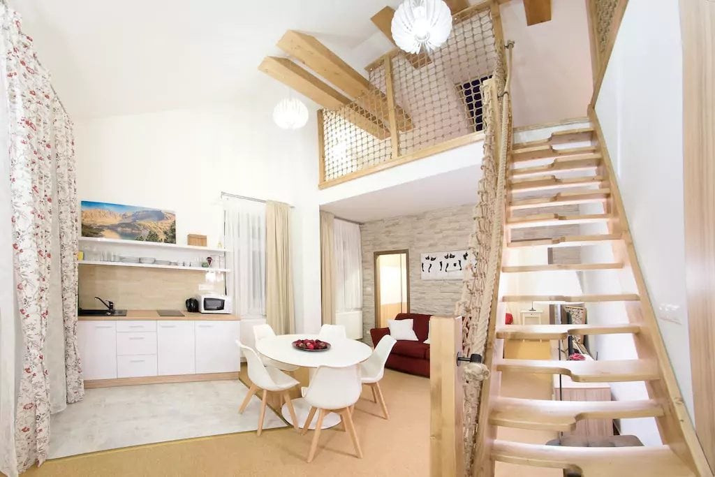 Mohlo by sa zdať, že v Tatranskej Lomnici nájdeš len typické horské chaty, no opak je pravdou. Ubytovanie tu vie byť naozaj luxusné, napríklad ako tento krásny mezonet. Svetlý a vzdušný interiér dvojposchodového apartmánu je zariadený do modernej bielej a zábradlie schodiska tvorí originálna sieť. Spacia časť je zaujímavo riešená a k apartmánu patrí aj malý balkón s výhľadom. Bývanie je hodnotené piatimi hviezdičkami a jeho cena začína na 140 eurách za noc.