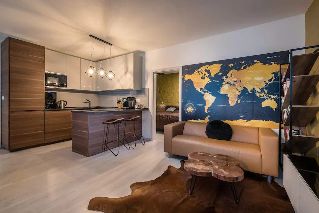 V obľúbenom lyžiarskom stredisku Donovaly môžeš nájsť aj takýto skvost. Dômyselne zariadený amartmán je ako vystrihnutý z fancy časopisu o bývaní a pokojne by mohol byť bytom cestovateľa. Dominuje mu veľká mapa na stene a prírodné solitéry a doplnky, ako stôl z pňa stromu či podložky z koží. K tomu kontrastuje zamatový gauč a teplo dodáva krb. Z terasy si môžeš vychutnávať výhľad na tataranskú prírodu. Cena začína na 130 eurách za noc.
