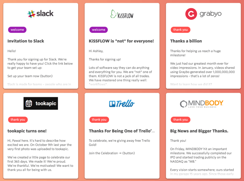 Email je ešte stále jedným z najefektívnejších spôsobov, ako vybudovať a upútať klientelu tvojho startupu. A písanie textov marketingových emailov je ešte stále jednou z najotravnejších úloh. Ak nechceš úplne objavovať Ameriku, vyskúšaj Good Email Copy. Je to kolekcia emailov spoločností ako Slack, Trello, Pinterest, Basecamp, Everlane, Eventbrite, Shopify a mnohých ďalších. Môžeš ich zoradiť podľa tagov (napr. vitajte, ďakujeme, pozvánka, nové funkcie atď.), čo ti veľmi uľahčí vyhľadávanie príkladov mailov, ktoré práve potrebuješ.
