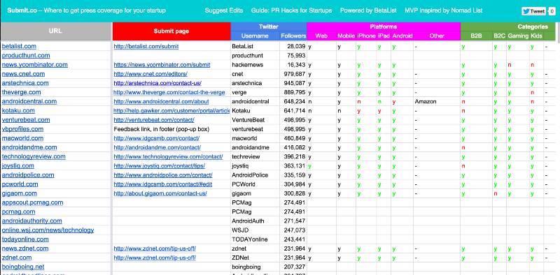Povedzme si na rovinu: Získavanie mediálneho pokrytia tvojho startupu alebo nového produktu nie je jednoduché. Našťastie existuje zoznam mediálnych portálov zameraných na technológie, ktoré si môžeš zoradiť podľa počtu Twitter followerov a Alexa ranku. Tento nástroj za teba neurobí všetku robotu (kontakty na konkrétnych novinárov si vo väčšine prípadov musíš nájsť sám), no určite ti to uľahčí vytvorenie prvotného zoznamu portálov, ktoré ťa dokážu najlepšie prezentovať. Je to skvelý prvý krok pri tvorbe tvojej PR stratégie.