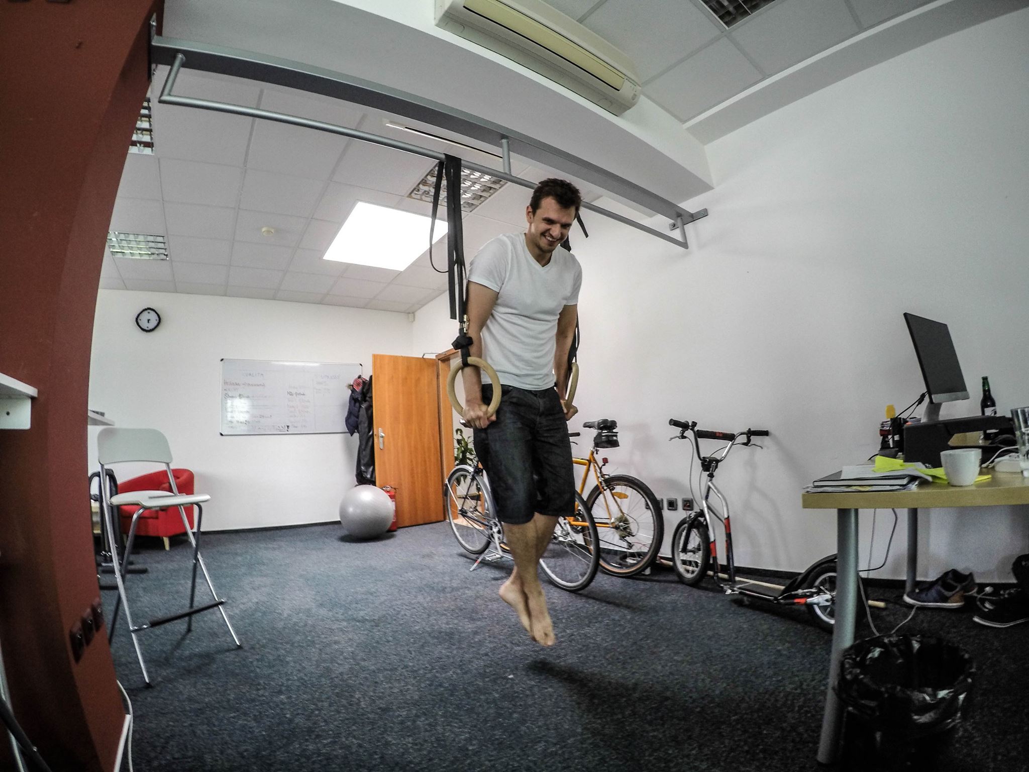 Napriek tomu trápite svoje telo viac, ako kedykoľvek v minulosti. Najmä chrbát. My sme sa rozhodli (v spoluprácií s Vladom Zlatošom) vylepšiť kancelárske priestory športovými pomôckami ako brádla, hrazdy, preliezky či gymnastické kruhy. Všetko máme namontované priamo v kancelárii, takže sa stačí počas cesty na WC (alebo možno skôr po ceste naspäť z WC) zopárkrát zavesiť, zodvihnúť, prehnúť a ponaťahovať troška telo.