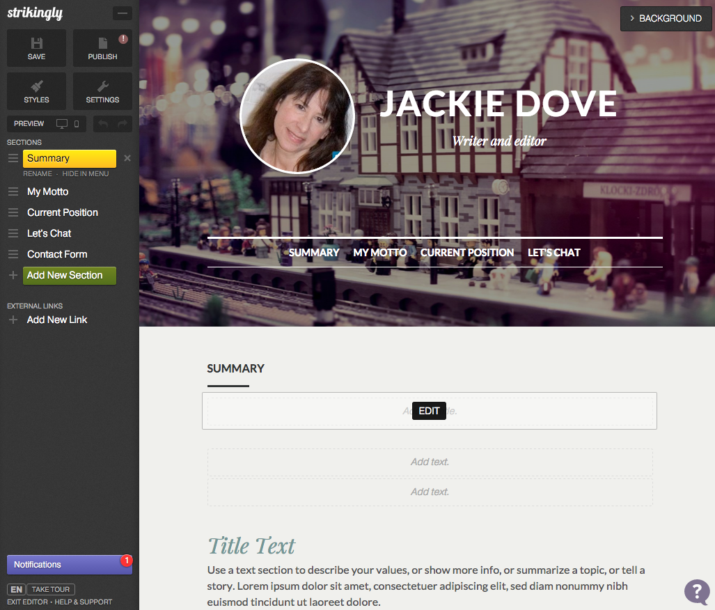 Jednoduchý, prehľadný, rozdelený na nasledujúce kategórie – business, store, portfolio, professional. Prelinky na sociálne siete sú tiež vstavané, poprípade sa dajú pridať a narábanie s multimediálnym obsahom je veľmi nenáročné. Niektoré časti stránky sa dajú dokonca zaheslovať a chrániť pred cudzím prístupom do výroby. Dokonca majú aj mobilné verzie, takže editovať sa dá aj na diaľku od počítača.