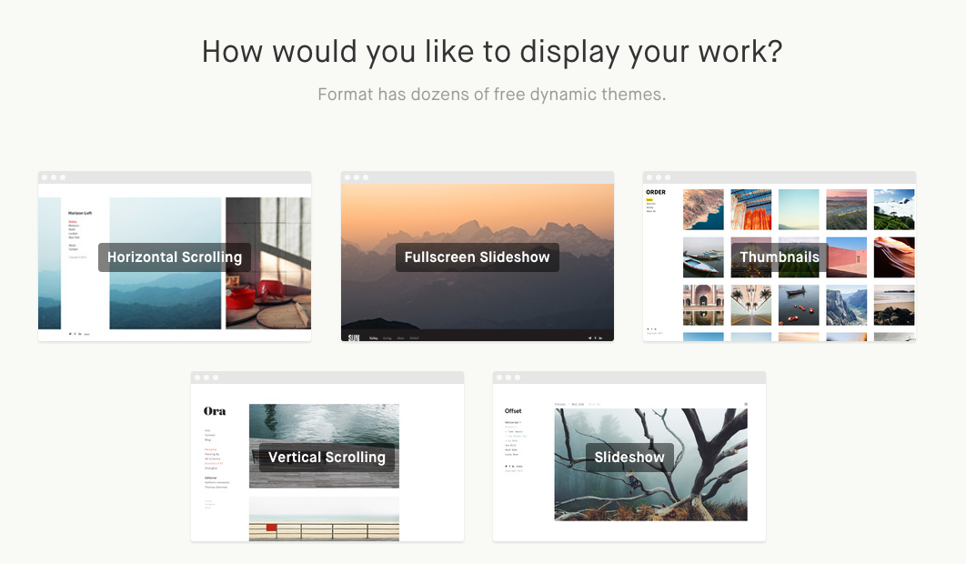 28 okamžitých minimalistických vzorkovníc, ktoré podčiarkujú najmä fotografický obsah. Sú rozdelené do rôznych kategórií, čo výber ešte uľahčuje. Výzor vlastnej stránky vie užívateľ presne odhadnúť ešte predtým, než na nej začne pracovať a začať sa dá aj bez registrácie či zdieľania svojich profilov na sociálnych sieťach.
