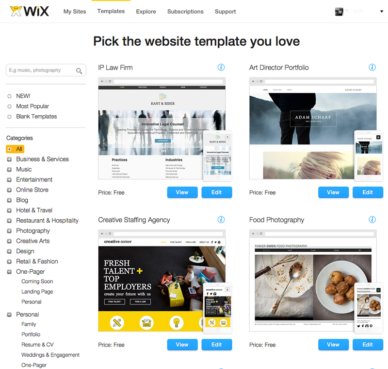 Stránky pre počítač aj pre smartphony vytvoríš práve vďaka Wix a dokonca sa do nich dá integrovať možnosť online platieb cez PayPal alebo authorize.net. Ich výber je široký a sústredí sa na všetky pracovné kategórie od obchodu až po reklamu, či dizajn. Všetky pokroky v tvorbe sa dajú hneď vizualizovať.