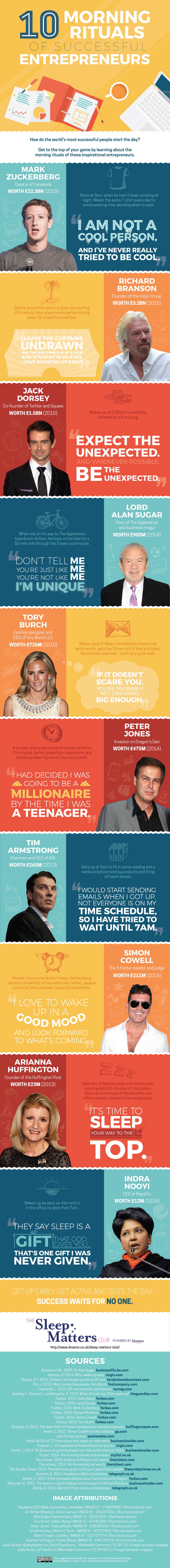 - Zatiaľ čo si väčšina z nás každé ráno posúva budík, o 5, o 10, o 30 minút, mnoho zo svetovo úspešných podnikateľov si vyvinulo rutinu, ako začať svoj produktívny deň. Vo všeobecnosti sa javí, že úspešní podnikatelia sú zväčša ranné vtáčatá, čo potvrdzuje aj nasledujúca aj infografika.