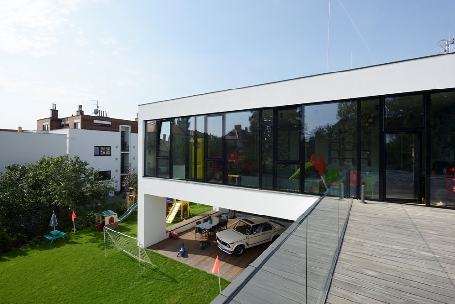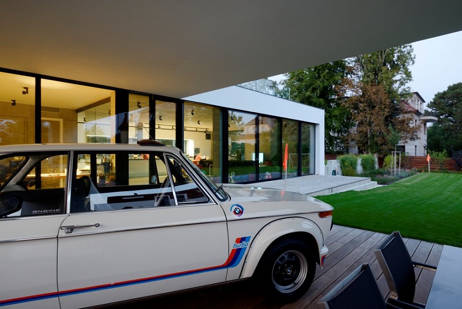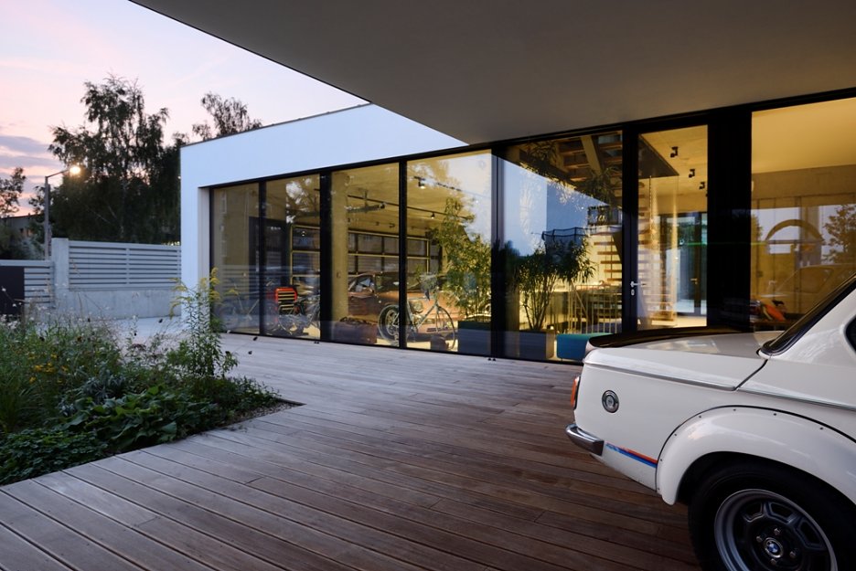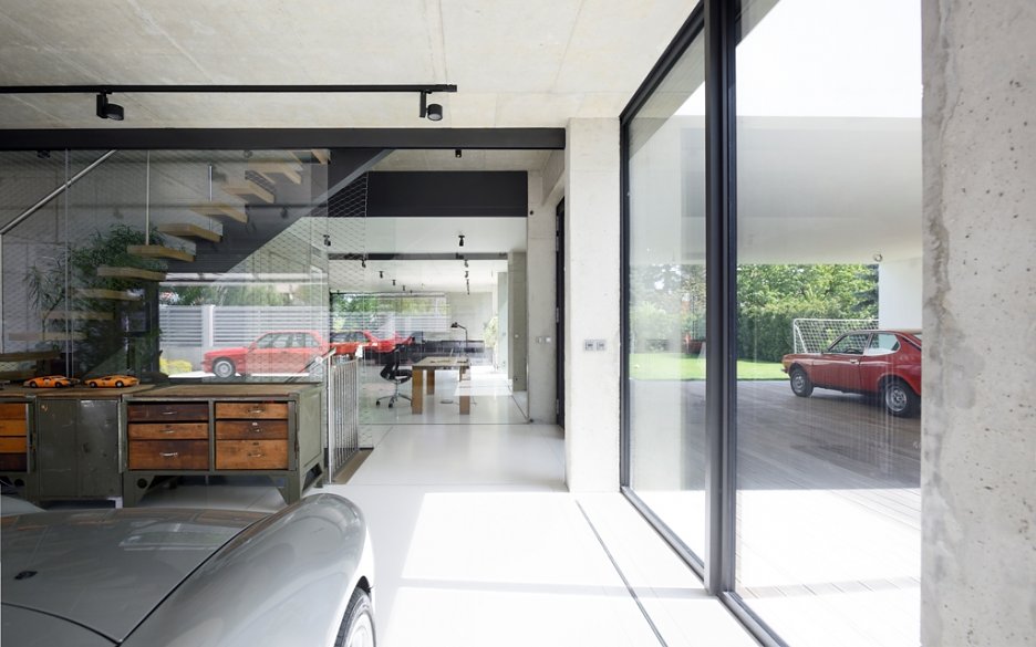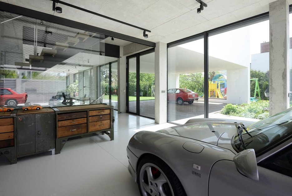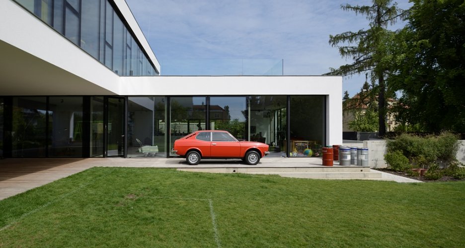 Pražská vila je obrazom životnej náplne investora, ktorou sa mu okrem rodiny stali autá. Rozľahlé prízemie pripomína autosalón a autom je možné vojsť takmer až do kuchyne. V podstate ide o bývanie v luxusnej garáži.