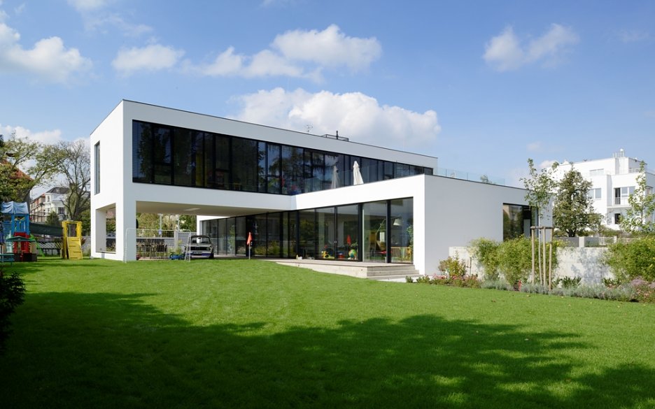 Konštrukciu domu tvoria dva hranoly, ktoré sú na seba kolmo položené. V suteréne betónového domu sa okrem veľkej garáže nachádza aj technické zázemie a menší byt pre rodičov alebo personál.