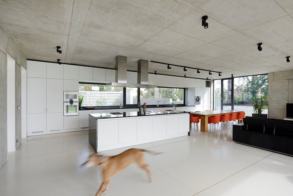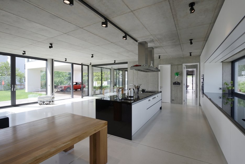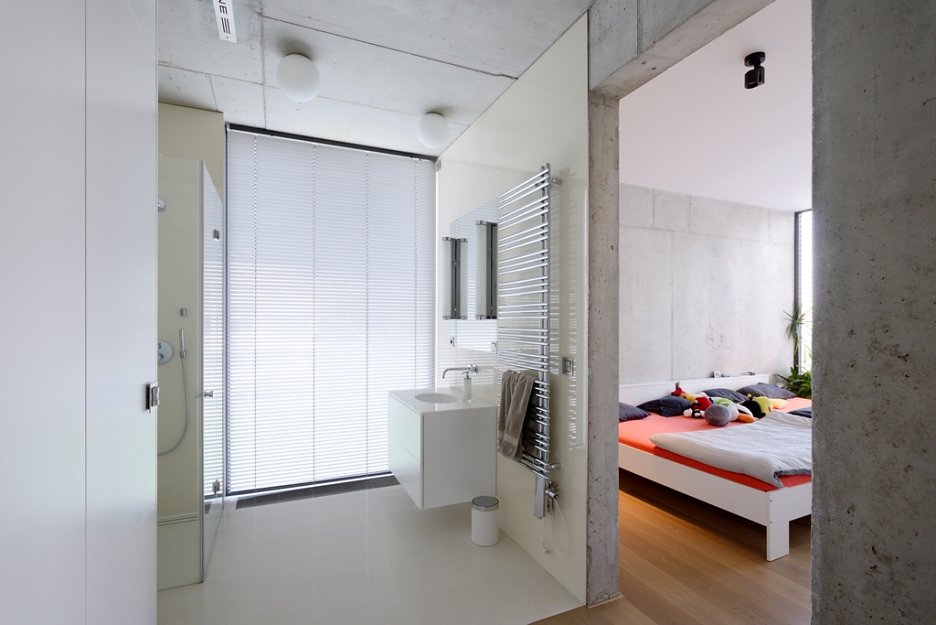Na prízemí ostal pohľadový betón v surovej podobe, bez ďaľších korekcií. Betónové steny a strop dopĺňa liata priemyselná podlaha. Priestory nočnej časti domu sú oživené dubovým drevom.