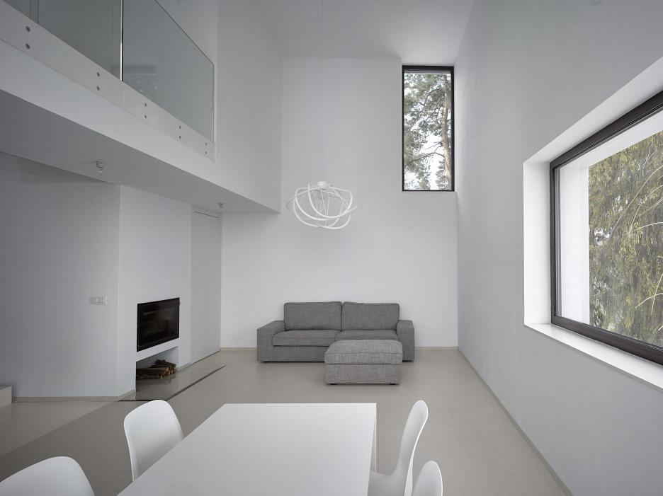 Dom má nosnú konštrukciu z betónových tvárnic a železobetónových stropov. Na fasáde je kontaktné zateplenie s jemnozrnnou bielou omietkou s hliníkovými oknami. Čierne rámy okien z interiéru lemujú pohľady na prírodu ako meniace sa obrazy. Neutrálne, čistý biely interiér im necháva vyniknúť, rovnako ako socharskému členeniu vnútorného priestoru.