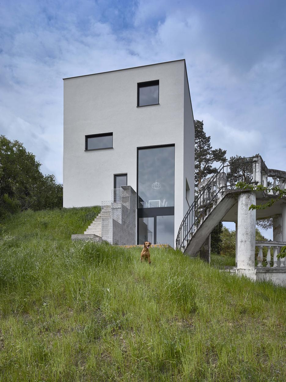 Pôvodná záhrada romantickej vily v historickej časti Všenory očarila autorov i majiteľa nielen krásnymi výhľadmi, dramatickým terénom ale aj pozostatkom na pôvodnú funkciu – romantickým kruhovitým altánkom s točitým schodiskom. Hoci sa jeho forma všetkým páčila, predstava o dome bola úplne v kontraste: prísna pravouhlá geometria, ktorú je podporená bielym prevedením aj v interiéri.