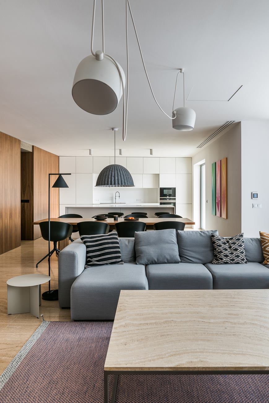 - Biela farba, prírodné drevo a travertín. Všetko zázemie je dôsledne integrované, ostáva iba čistý obytný priestor