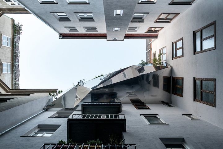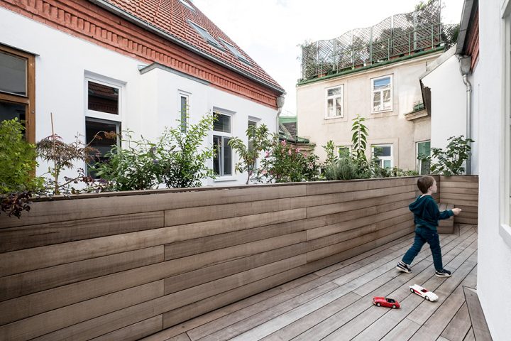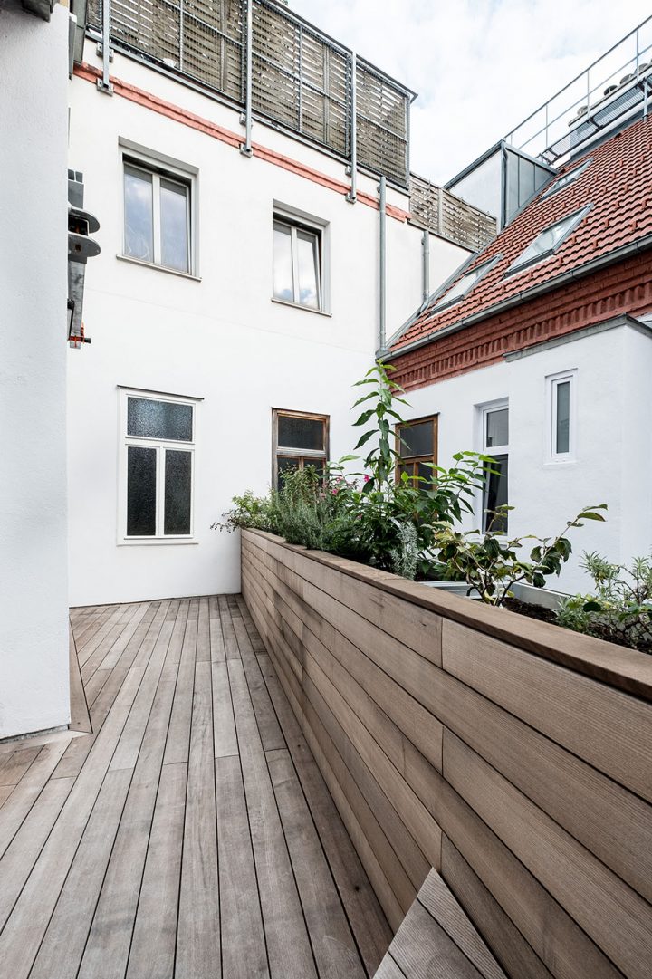 Mladá rakúsko-talianska rodina si vybrala byt vo štvrti Wieden najmä kvôli pešej dostupnosti centra a bohatému kultúrnemu životu v okolí. Pri bývaní v blízkosti centra však treba rátať s nedostatkom priestoru a absenciou privátnej záhrady či exteriéru. Súkromie je v hustej mestskej štruktúre vzácna komodita. Aj preto obyvatelia bytu v zrekonštruovanom historickom objekte prišli s nápadom rozšírenia malej obývačky o bylinkovú záhradku, sedenie a stolovanie v exteriéri