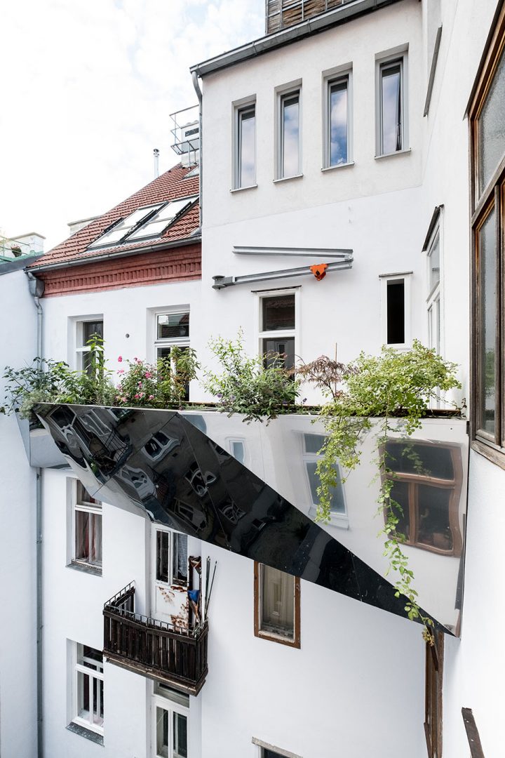 Vonkajší plášť z leštenej nehrdzavejúcej ocele zrkadlí denné svetlo, čím čiastočne kompenzuje negatívny dopad konzoly tieniacej vnútorný dvor. Lomené plochy “rozbíjajú” zrkadlený obraz na atraktívnu mozaiku. Táto “kamufáž” ukrýva z vnútornej strany pobytovú terasu obloženú drevenou palubovkou. Bariéru medzi súkromným priestorom a vnútroblokom tvoria odnímateľné žlaby s rastlinami, ktoré sú elegantne integrované do vonkajšieho plášťa.