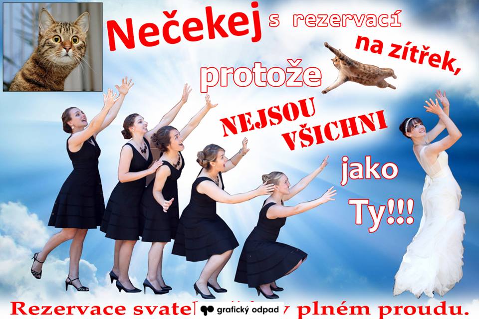 Aj ty sa pýtaš, čo týmto chcel vlastne autor povedať? Nie si sám. Udivene sedíme za monitorom aj my. Pochopiť, čo sa na tomto plagáte deje je skutočne náročné – čím dlhšie sa naň pozeráš, tým viac otázok sa ti vynára v hlave. Prečo napríklad nevesta hádže mačku a nie kyticu? A prečo sa celý dej odohráva v nebi? Odpoveď sa pravdepodobne nikdy nedozvieme.