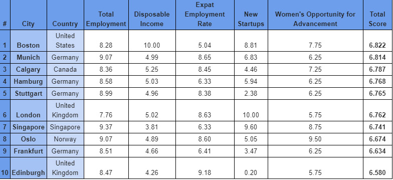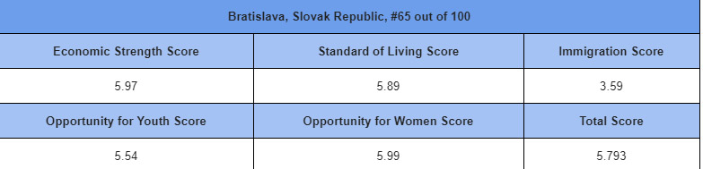 Najvyššie skóre zo všetkých hodnotených krajín dosiahlo americké mesto Bostom s celkovým skóre 6,82 z možných 10. Ako druhé najperspektívnejšie mesto na nájdenie si práce bol nemecký Mníchov, za ktorým nasledovalo kanadské Calgary. Bratislava sa umiestnila v dolnej polovici rebríčku a to na 65-tej pozícii s celkovým skóre 5.793. Čo sa týka mikro faktorov, ktoré vplývali na tento index, najlepšie sme si viedli v oblasti pracovných príležitostí pre ženy, naopak najhoršie skóre dosiahla Bratislava v prijmaní cudzincov.