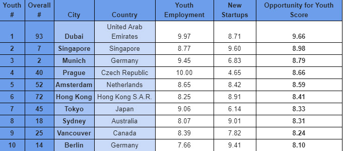 Susedné Česko na čele s Prahou sa umiestnilo na 40. priečke s finálnym skóre 6,12. Praha dokonca získala plný počet bodov v kategórii príležitostí na zamestnanie pre mladých ľudí. Ako absolútne najhoršie mesto na hľadanie si práce v roku 2018 vyšli grécke Atény s celkovým skóre len 3,79. Atény sa dokonca umiestnili za Mexikom – 4,22 boda či hlavným mestom Chile – Santiago s 4,57 bodmi.