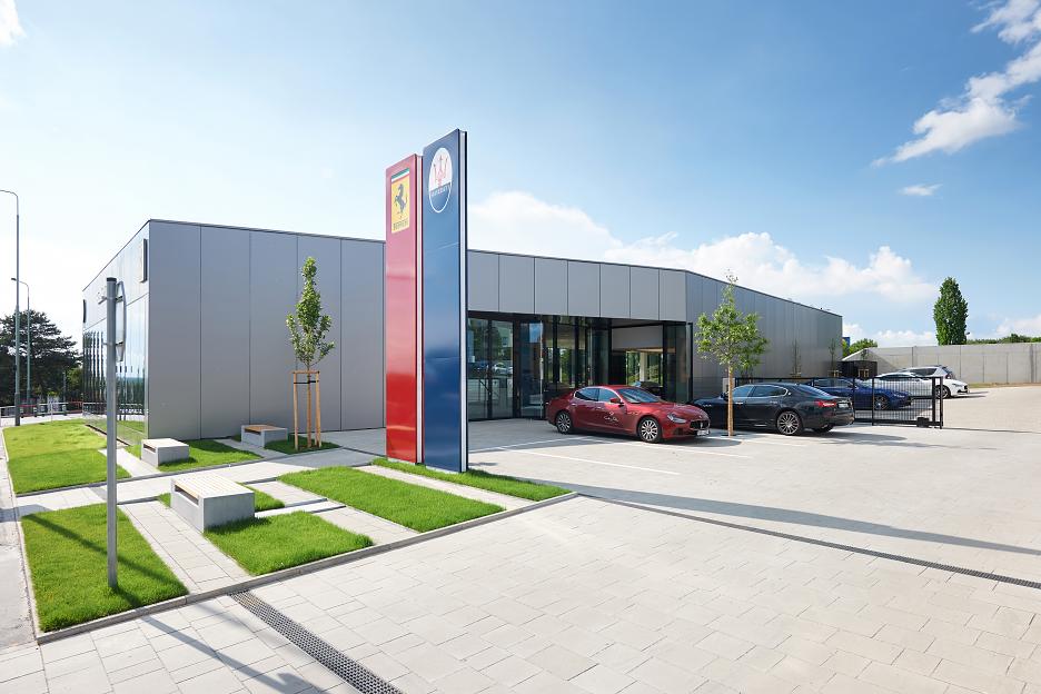 „Lehké vykonzolování jihozápadního rohu objektu dodává budově na lehkosti. Ostré a čisté tvary showroomu jsou inspirovány tvaroslovím automobilů Ferrari osmdesátých let. Vstup do objektu evokuje boční chladící sání legendárního Ferrari Testarossa. Urbanistické tvarování a zalomení objektu do tvaru V potom reaguje na zalomení ulice Slánská. Tímto lehkým natočením je zároveň dosaženo lepší vizibility obou částí bibrandového showroomu,“ ozrejmujú kocept autori. Nová budova vznikala v napojení na jestvujúci servis. Architekti sú tiež autormi riešenia exteriérov a prevádzky v areáli.