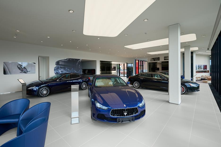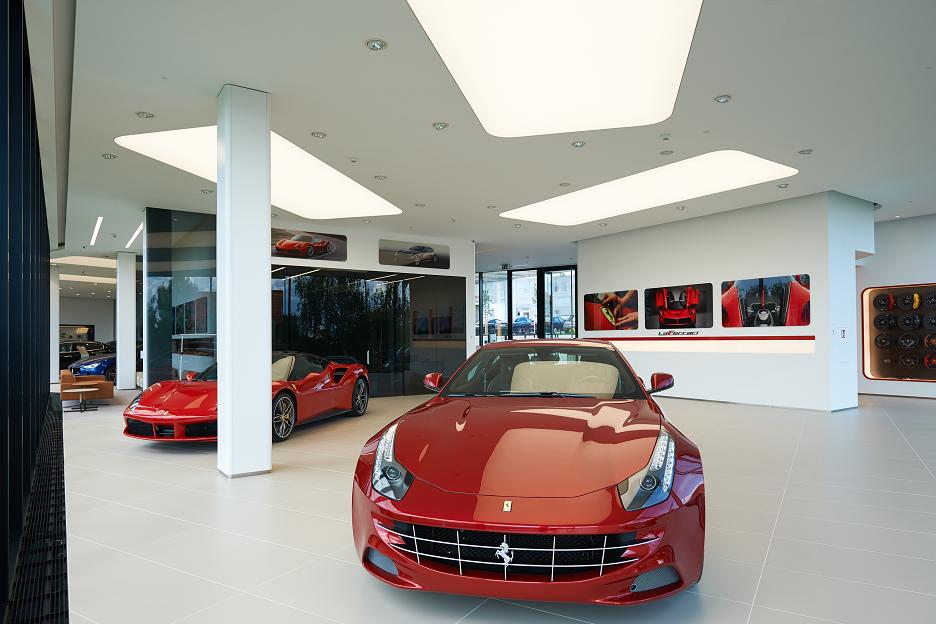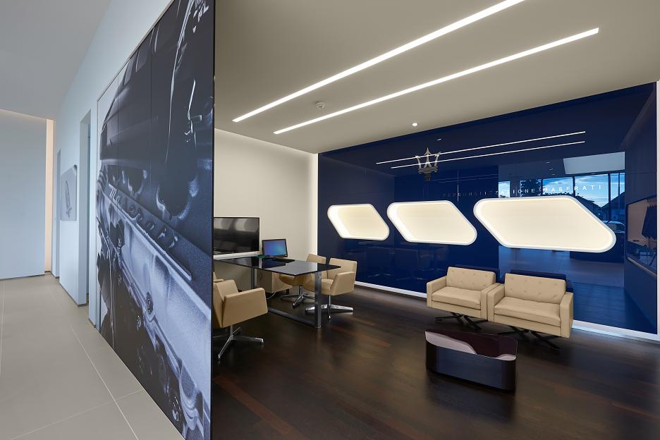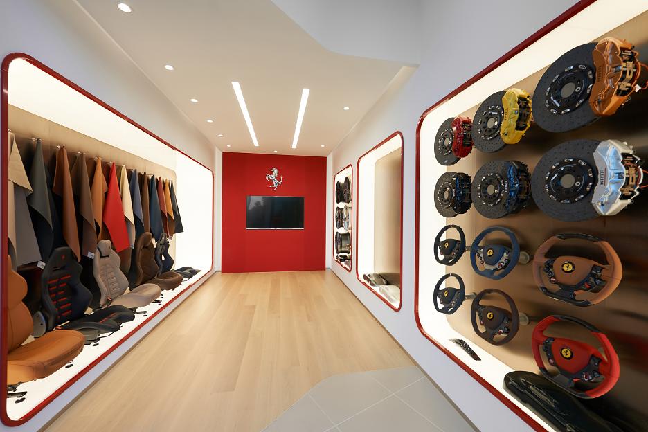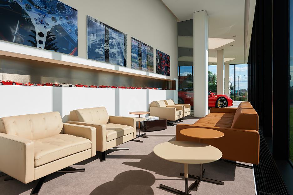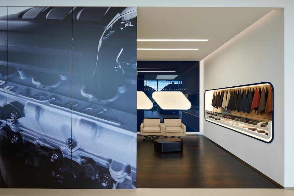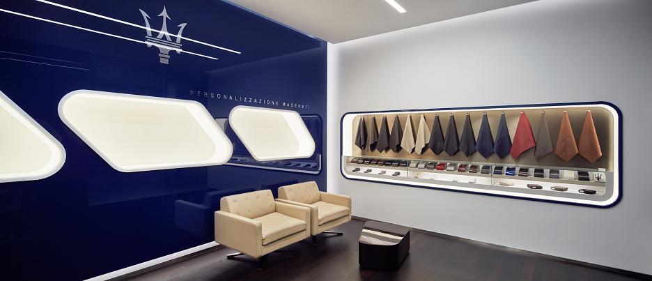 Interiér odráža renomé značiek Ferrari a Maserati. Ide o čisté a línie s precíznym detailom. Automobily sú v interiéri vystavené ako v galérii. Zhora sú autá nasvietené cez barrisolové blany. Prvky vystavované v konfiguračných miestnostiach sú umiestňované do svetelných nik, ktoré sú potiahnuté kožou.