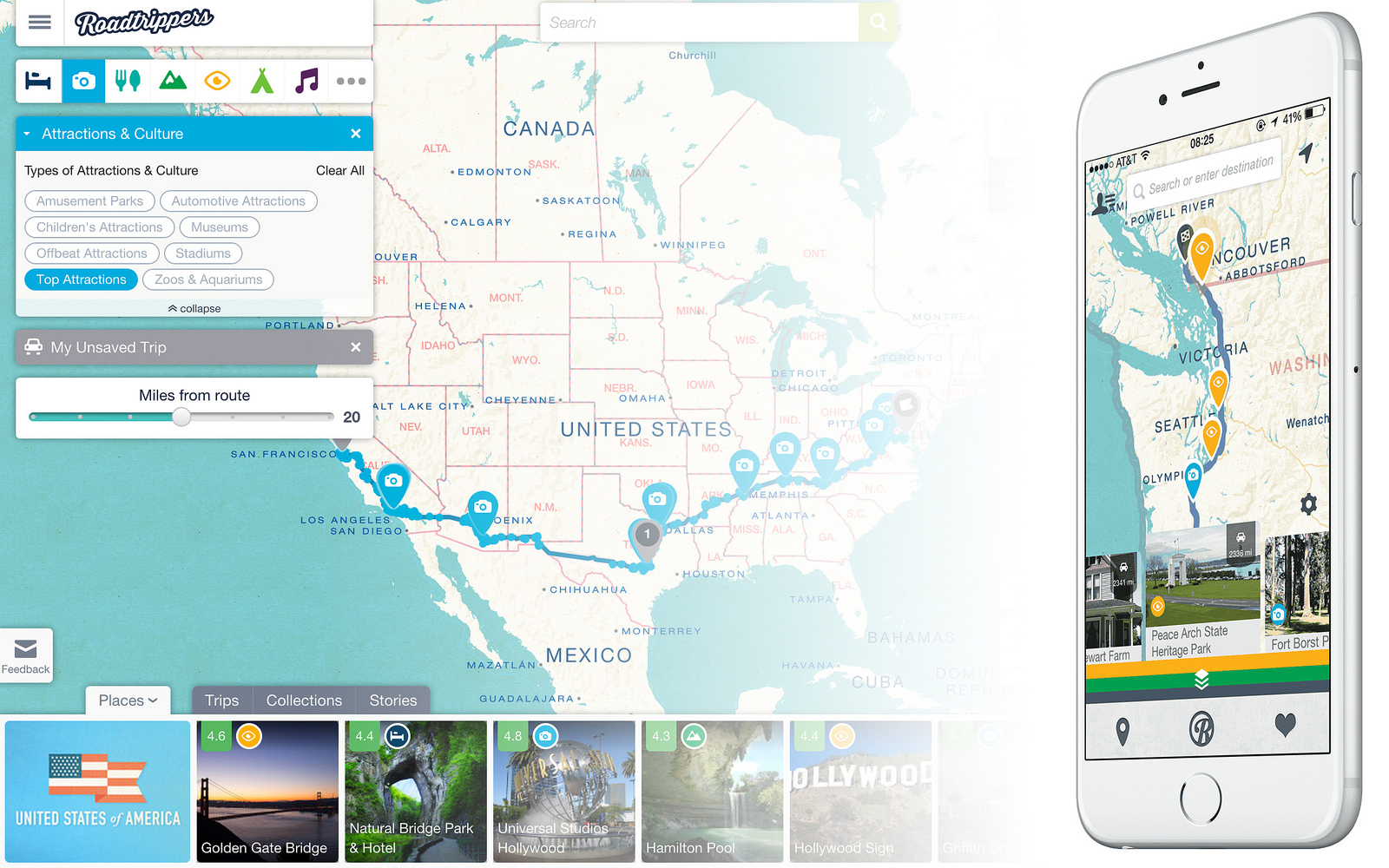Napíš do aplikácie odkiaľ vyrážaš, cieľovú destináciu, dátum cesty a svoje záujmy a Roadtrippers ti naplánuje skvelý výlet. Nájde atrakcie, reštaurácie, múzeá, zábavné parky, kempy a všeličo iné. Ak počas cesty nájdeš odbočku kam by si chcel zájsť, jednoducho si ho pridáš a Roadtrippers ti prekreslí trasu cesty a nájde ďalšie veci, čo by ťa mohli zaujímať.