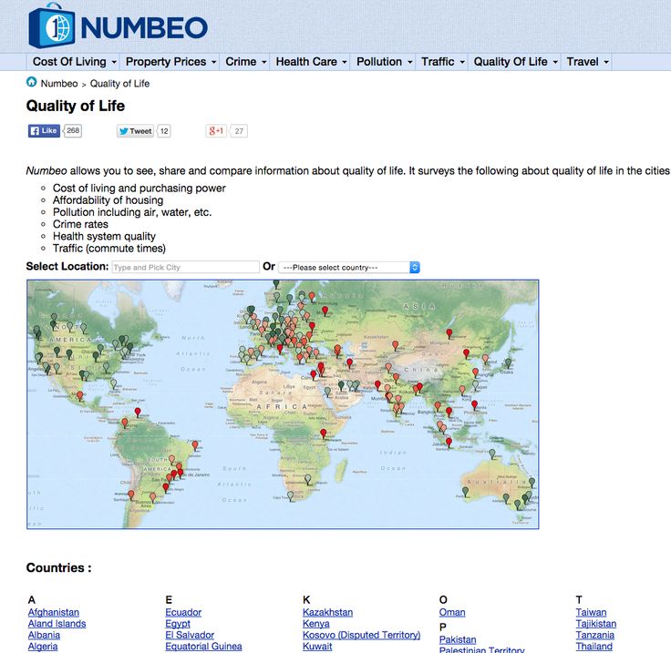 Pokiaľ sa ešte len chystáš na dovolenku a zisťuješ si info o jednotlivých krajinách, skús Numbeo. Je to najväčšia svetová databáza, kde jednotliví užívatelia pridávajú informácie o mestách a krajinách po celom svete. Aktuálne poskytuje informácie o životnej úrovni v jednotlivých krajinách, vrátane nákladov na život. Nájdeš tu všetko od cien ubytovania, úrovne zdravotnej starostlivosti, situácie v doprave, kriminálnej činnosti až po informácie o miere znečistenia ovzdušia. Primárne funguje ako webstránka numbeo.com.