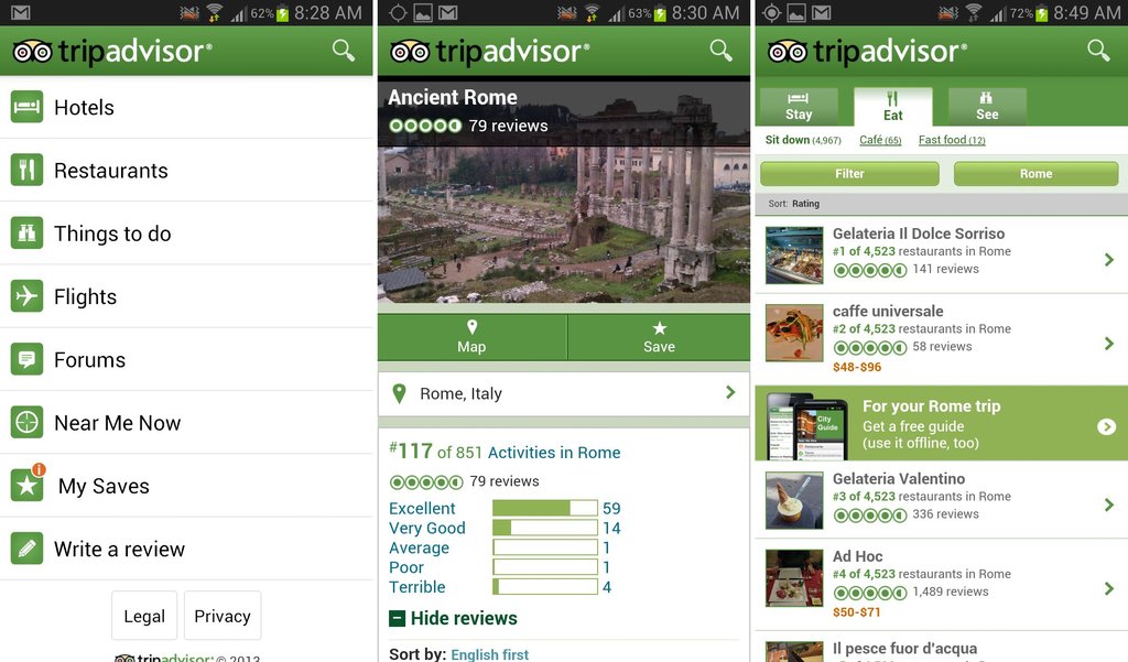 TripAdvisor patrí medzi najlepšie aplikácie pre cestovateľov. Poskytuje recenzie hotelov, reštaurácií a miest v okolí. Obsahuje aj fotky nahraté ostatnými užívateľmi, ktoré poskytujú reálnejší pohľad než skreslené fotky cestoviek a rôznych promo stránok. TripAdvisor je asi naobsažnejšia aplikácia tohto typu, keďže má veľmi veľkú a aktívnu komunitu užívateľov.
