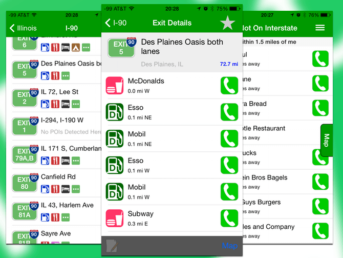 Ak cestuješ autom na dlhú vzdialenosť, iExit ti napovie, aké služby sú poblíž diaľničných výjazdov. Pokrýva predovšetkým americké diaľnice, zistí, kde sa nachádzaš a nájde najbližší diaľničný výjazd a ponúkne ti zoznam reštaurácií, hotelov, čerpacích staníc či odpočívadiel v okolí. Ak máš nejakú obľúbenú sieť reštaurácií, môžeš si ju pridať do obľúbených a iExit ti dá vedieť, ak sa nejaká bude nachádzať v tvojej blízkosti. Ušetríš si nervy, že si zišiel z diaľnice príliš skoro, alebo že si zabudol odbočiť.