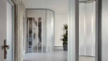 Maximálne otvorený a plynúci priestor bez dverí členia iba oblúkové polopriečky z copilitu – sklenené tvárnice.