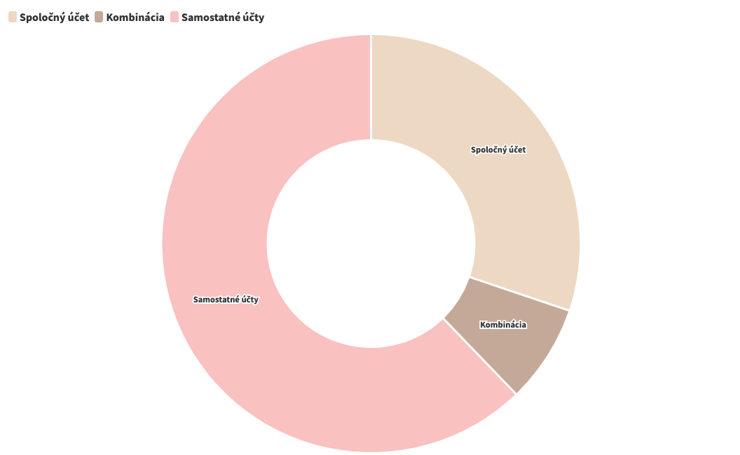 Približne 30 percent Slovákov má spoločný rodinný účet. Väčšina domácností (62 percent) však funguje tak, že každý z partnerov má samostatný účet. Dôvod je ale prozaický. Takmer 40 % tvrdí, že to je preto, že to tak mali pred začiatkom vzťahu a doteraz s tým nič nespravili. Asi pätina to takto má kvôli šetreniu na poplatkoch.