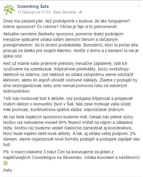Mal som česť niekoľko týždňov v Coworkingu Šaľa pracovať – bolo to práve v časoch, keď som si čerstvo založil živnosť a ponoril sa do sveta freelancingu. Keď som potom odchádzal, Peťo (Peter Bartoš, spoluzakladateľ Coworkingu Šaľa) mi dal nemalú zľavu bez toho, aby som ho o to žiadal. Prečo? Vraj preto, že mladých šikovných ľudí zo Šale radi podporia. Tento čin úplne vystihuje z môjho pohľadu to, o čom CW v Šali je.