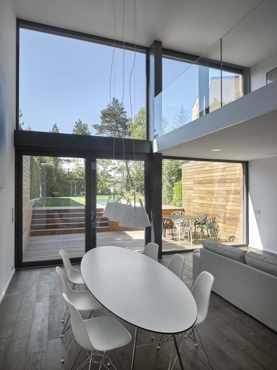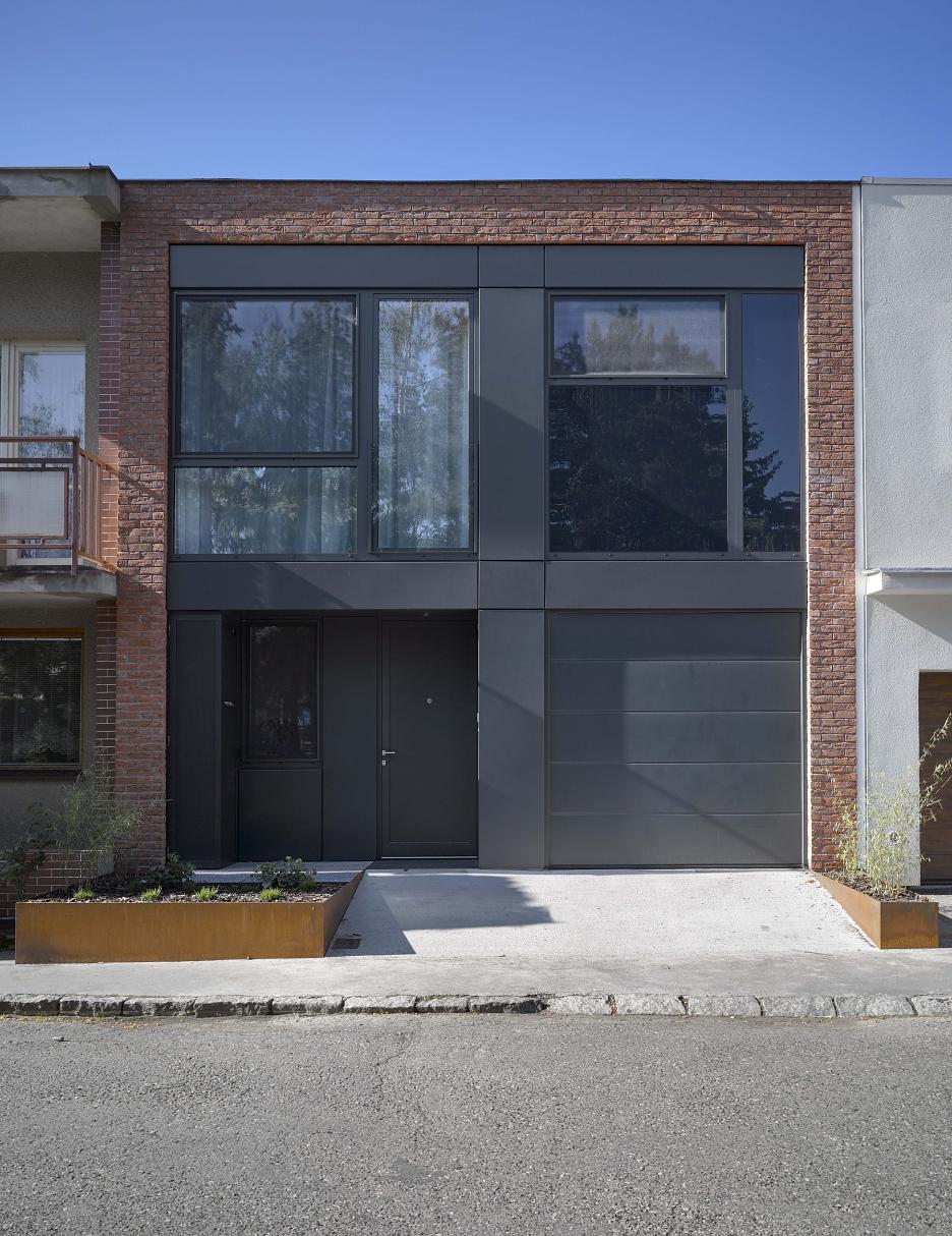 Zobraziť celú galériu (11)Z jihu jsou obytné místnosti prosvětleny velkoformátovým prosklením, které tvoří de facto celou fasádu. Tepelnou pohodu zajišťují venkovní žaluzie, které jsou automaticky řízené. Z ulice – ze severu je zopakován princip z jižní fasády. Velké prosklené plochy zde však z větší části nahrazují plné plechové plochy, za nimiž je garáž a koupelna. Černo-skleněný plášť je zvýrazněn lemem z červených lícových cihel, prvku stmelujícího původní výraz domu s moderní přestavbou.