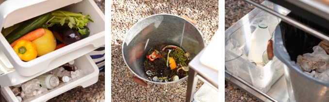 Aj keď v tejto grilovacej kuchyni nie je elektrina, nie je to nevyriešiteľný problém. Chladnička je totiž vytvorená z dvoch bielych umelohmotných košov. Časom som zistil, že, ak naplním spodok koša ľadom, všetky nápoje (a ďalšie potrebné veci) budú chladené počas celého večera. Chlad zo spodného koša prenikne aj do vrchného, takže tam si uložím šalát a zeleninu, aby boli veci na burgre čerstvé a chrumkavé.
