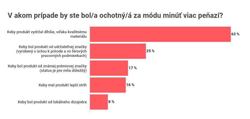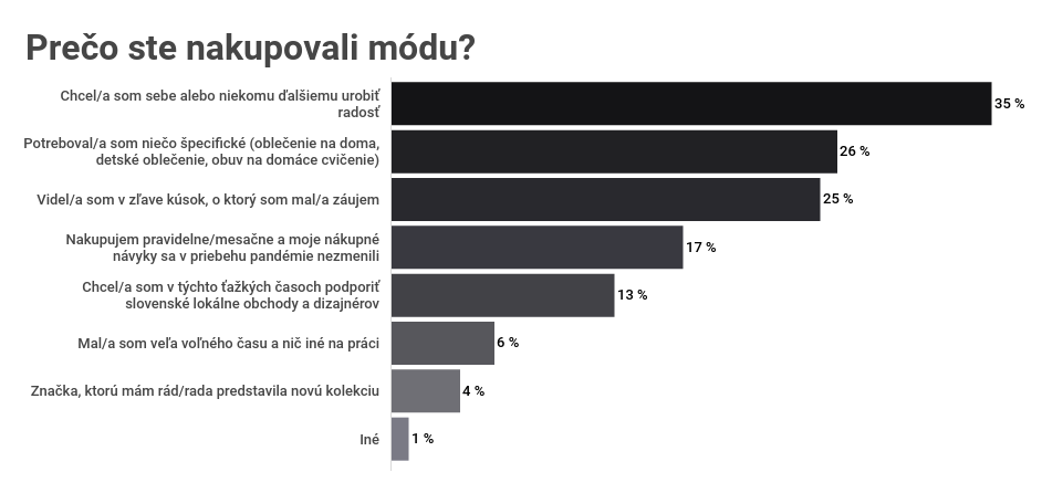 Hlavným dôvodom nákupu Slovákov bolo urobiť radosť sebe alebo niekomu blízkemu (35 %), prípadne potreba nového kúsku, ktorý sa im v aktuálnej situácii zišiel (oblečenie na doma, obuv na domáce cvičenie, detské veci). Až 17 % deklarovalo, že sa ich nákupné zvyky vôbec nezmenili ani počas koronavírusu. Ľudia mysleli nielen na seba, ale aj na podporu lokálnych obchodov a dizajnérov, ktoré podporilo až 13 % opýtaných.