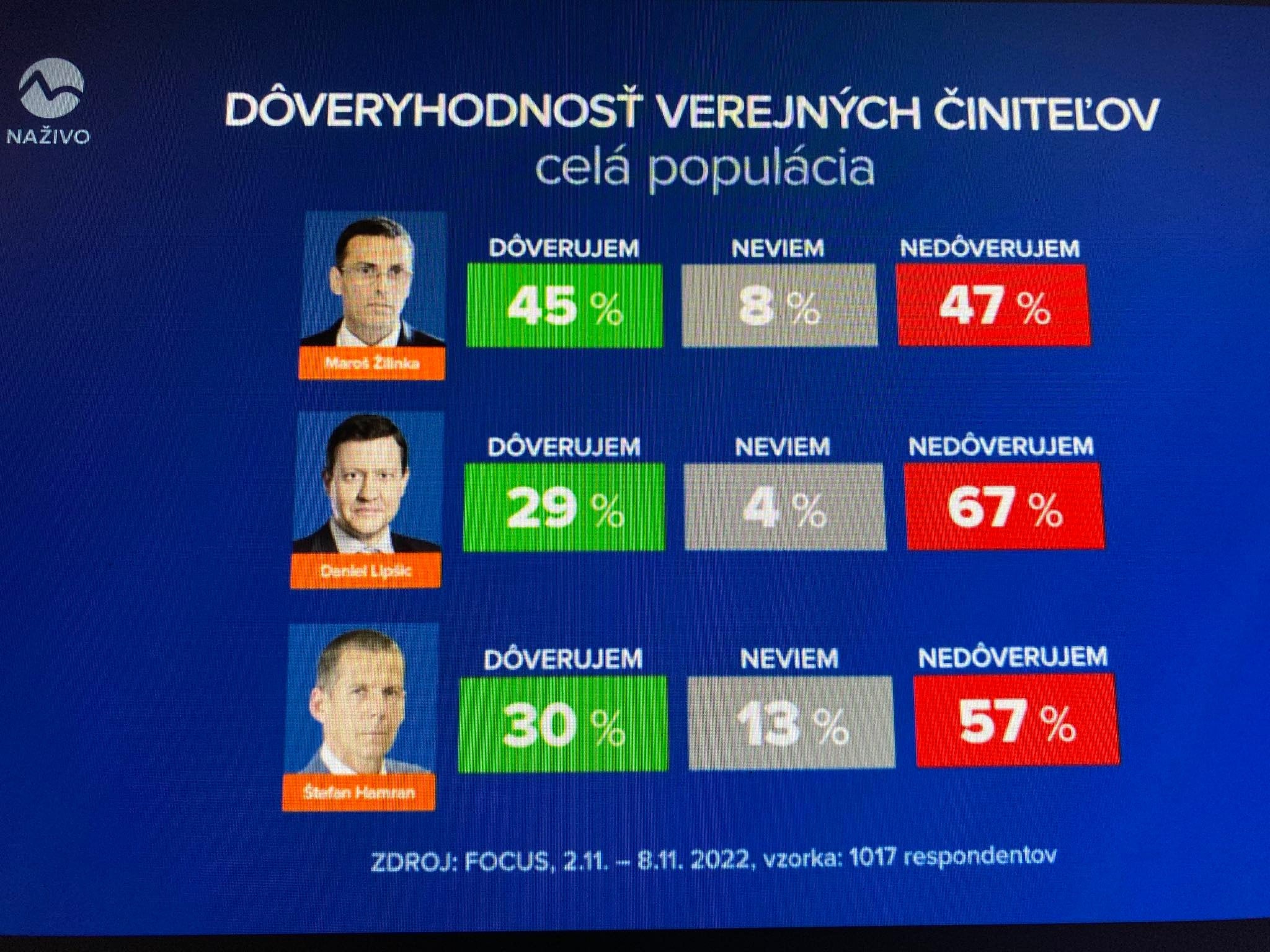 Ako z prieskumu vychádza, Marošovi Žilinkovi dôveruje 45 % ľudí, Danielovi Lipšicovi 29 % a Štefanovi Hamranovi 30 % z opýtaných.