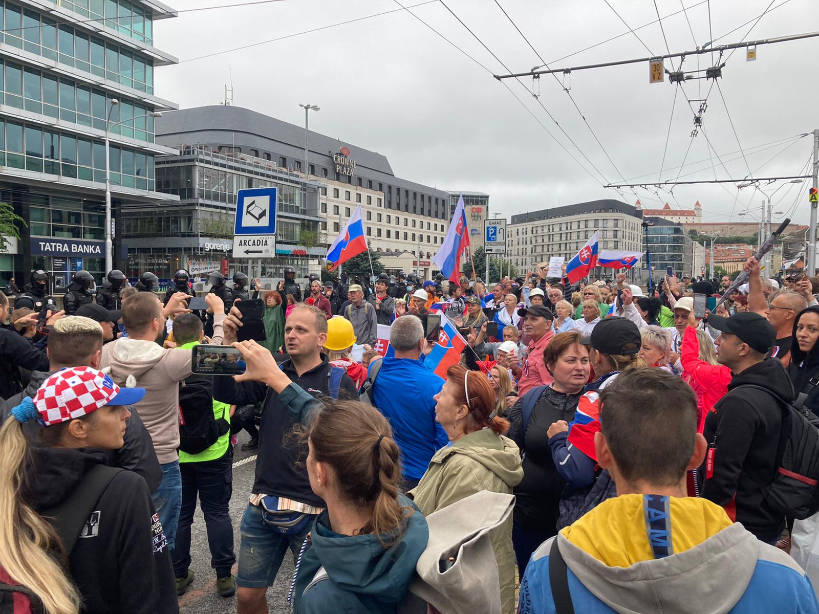 • Aktuálne sa protestujúci snažili blokovať cesty. Autá s logom strany Kotlebovcov zablokovali Panónsku cestu, protestujúci sa pokúšali obsadiť cestu na Hodžovom námestí
