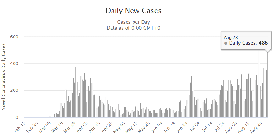 Najvyšší denný prírastok bol v Česku zaznamenaný koncom minulého týždňa, kedy pribudlo vyše 500 nových prípadov. Počet potvrdených prípadov nákazy koronavírusom sa tak v ČR vyšplhal na 23.777. Aktuálne infikovaných je podľa oficiálnych štatistík 5861. Celkovo bolo vykonaných už vyše 880.000 testov. Vyliečilo sa 17.497 ľudí. V súvislosti s koronavírusom zomrelo 419 ľudí. Hospitalizovaných je 139 ľudí.