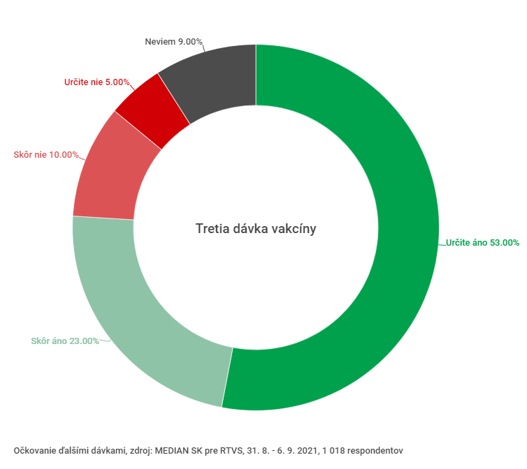 Podľa prieskumu agentúry Median SK, ktorý robila pre RTVS, je za očkovanie ďalšími dávkami vakcíny až 53 percent Slovákov. Za možnosť skôr áno hlasovalo 23 percent opýtaných a za možnosť skôr nie 10 percent opýtaných. 5 percent Slovákov možnosť tretej dávky určite nevyužije a 9 percent na otázku odpovedať nevedelo. Do prieskumu sa zapojilo 1 018 respondentov.